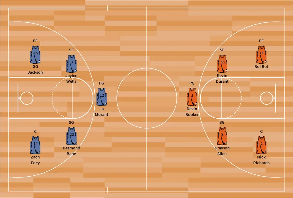 - GG Jackson (PF): Filling in for Jaren Jackson Jr., GG Jackson brings energy and versatility to the frontcourt.