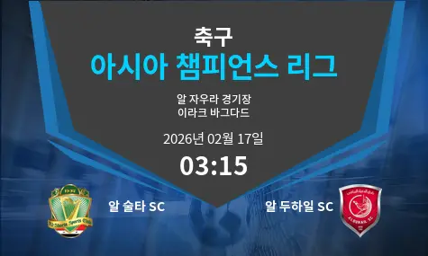 알 술타 SC와 알 두하일 SC 간의 매치는 알 자우라 스타디움에서 2026년 2월 17일 03:15에 열립니다. 두 팀 모두 강력한 팀으로, 흥미진진한 경기가 예상됩니다.