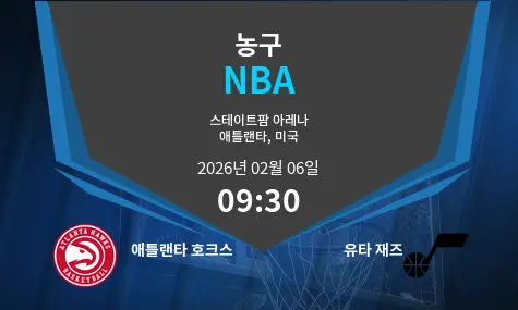 애틀랜타 호크스 VS 유타 재즈 매치 개요: 이 경기는 조지아주의 스테이트 팜 아레나에서 2026년 2월 6일, 오후 9시 30분에 열립니다. 이번 매치는 두 팀 간의 강력한 대결이 예상됩니다. 애틀랜타 호크스는 최근 홈 경기에서 강력한 성과를 보여주고 있으며, 유타 재즈는 원정 경기에서도 충분히 도전할 준비가 되어 있습니다.