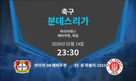 바이어 04 레버쿠젠과 FC 생 파울리 1910의 매치업은 2026년 2월 14일에 바이아레나에서 밤 23:30에 개최될 예정입니다. 이 경기는 두 팀 간의 전술적 격돌로 기대되며, 레버쿠젠의 공격력과 생 파울리의 수비 전략이 주목됩니다.