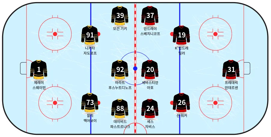 - 세바스티안 아호 (C, No. 20): 16포인트(6골, 10어시스트)로 팀 득점 선두이며 탑 라인의 구심점 역할을 합니다.