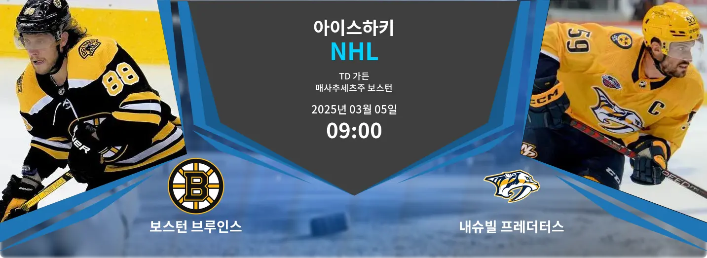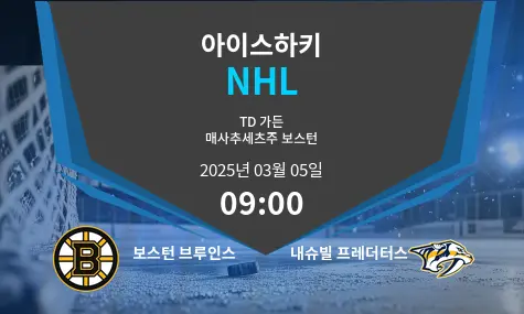 보스턴 브루인스와 내슈빌 프레데터스가 2025년 3월 5일 오전 9시(KST)에 매사추세츠주 보스턴의 TD 가든에서 맞대결을 펼칩니다. 이번 경기는 보스턴의 빠른 공격력과 내슈빌의 균형 잡힌 플레이 스타일이 맞붙는 흥미로운 경기입니다. 양 팀 모두 플레이오프 경쟁을 위해 승리가 중요한 만큼, 치열한 승부가 예상됩니다. 또한, 양 팀의 핵심 수비수들이 부상으로 결장하기 때문에 경기 결과에 큰 영향을 미칠 가능성이 큽니다.