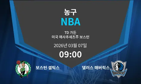보스턴 셀틱스와 댈러스 매버릭스는 매사추세츠 보스턴의 TD 가든에서 2026년 3월 7일, 09:00에 맞붙습니다. 이번 경기는 양 팀의 치열한 승부가 예상되는 중요한 경기입니다.
