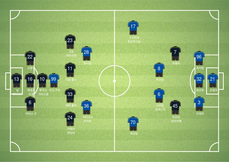 - 야고 카리엘로 (센터포워드) – 울산의 주 공격수로 득점 기회를 만들어내는 역할을 맡고 있음.