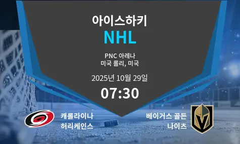 캐롤라이나 허리케인스는 2025년 10월 29일, 미국 롤리의 PNC 아레나에서 베이거스 골든 나이츠를 상대합니다. 허리케인스는 시즌 초반 5승 1패의 좋은 성적을 유지 중이며, 골든 나이츠는 정규시간 패배 없이 5승 2연장패를 기록하고 있습니다. 두 팀 모두 경기당 평균 4골 이상을 기록하며 강력한 공격력을 자랑합니다. 캐롤라이나는 세바스찬 아호와 세스 자비스를 중심으로 균형 잡힌 공격을 펼치고 있으며, 베이거스는 잭 아이켈과 이반 바르바셰프의 날카로운 공격 전개가 핵심입니다.