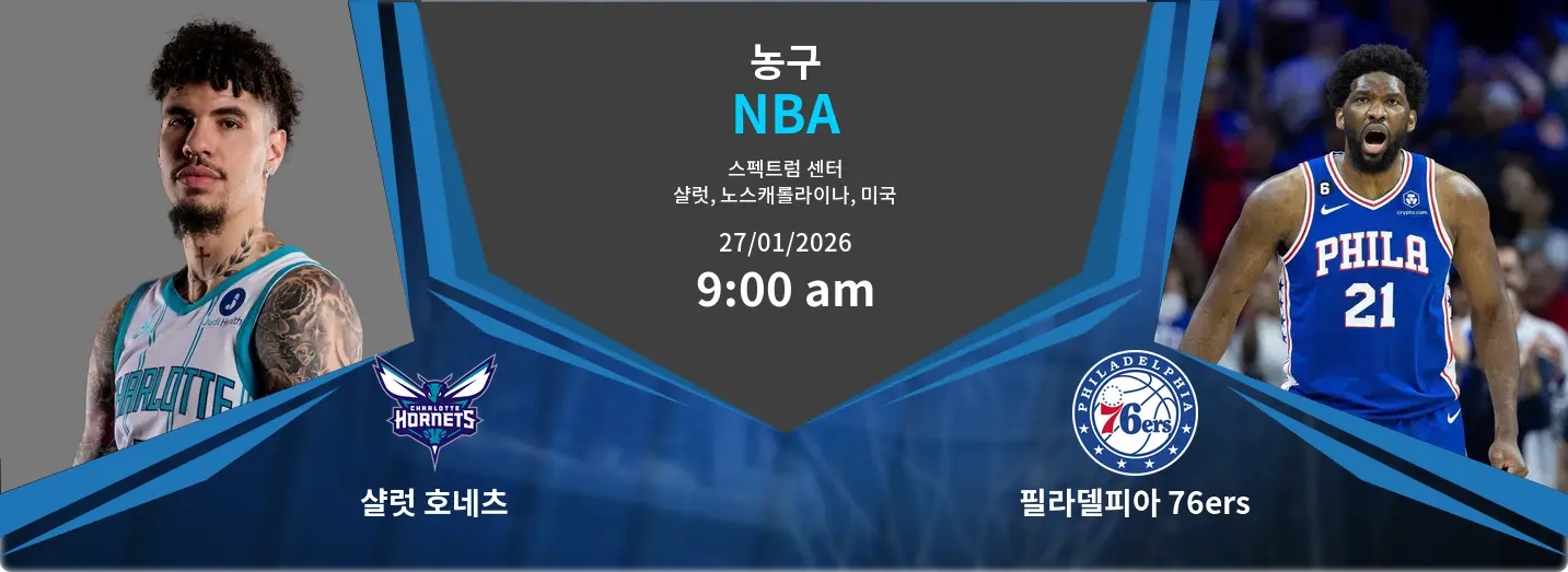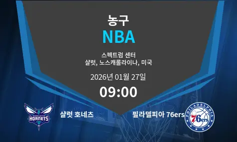 이번 경기는 2026년 1월 27일, 샬럿의 Spectrum Center에서 열리며, 경기 시작 시간은 09:00입니다. 샬럿 호네츠와 필라델피아 76ers는 승리를 위해 치열한 경쟁을 펼칠 것입니다.