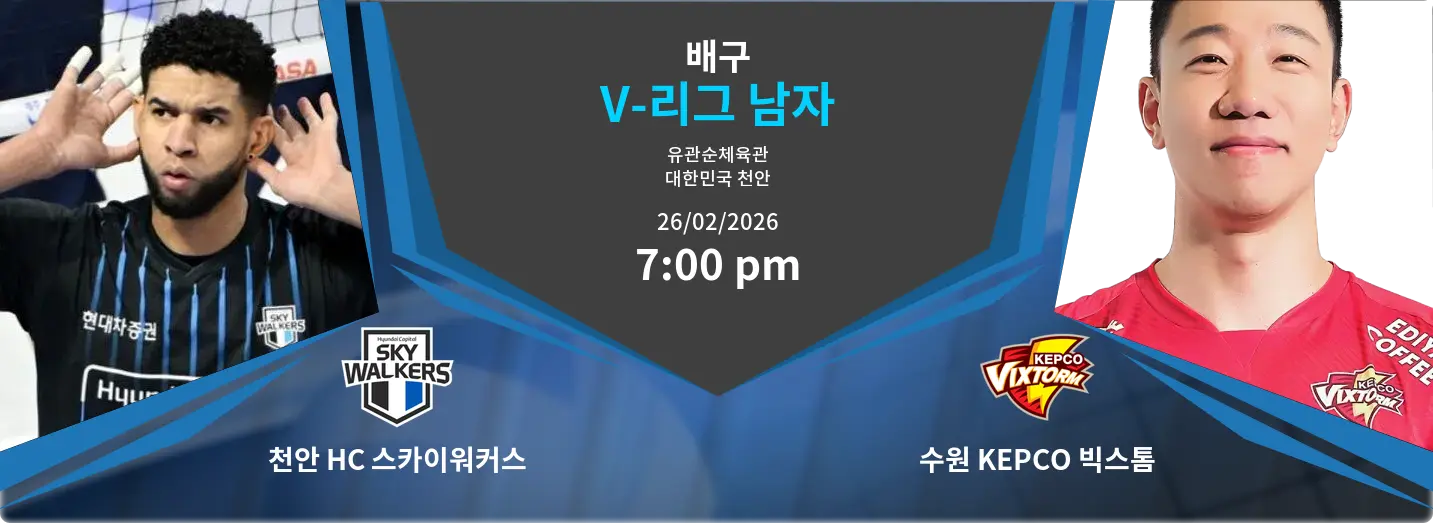 2026년 2월 26일, 천안의 유관순체육관에서 개최되는 이 경기에서 천안 HC 스카이워커스와 수원 KEPCO 빅스톰이 만나게 됩니다. 이 경기는 저녁 19:00에 시작됩니다. 두 팀 모두 뛰어난 경기력을 보여줄 것으로 기대되며, 치열한 승부가 예상됩니다.