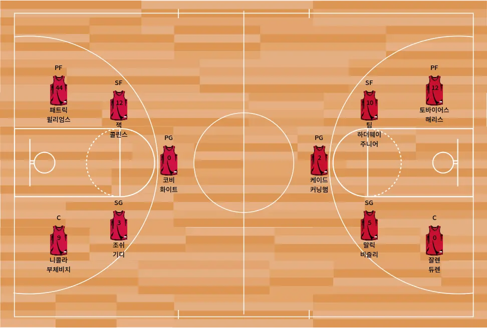 - 잘렌 듀렌 (C) – 강력한 리바운드와 림 프로텍션 능력을 갖춘 선수로, 시카고의 세컨 찬스 득점을 막는 것이 중요하다.