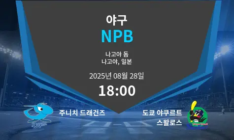 2025년 8월 28일, 일본 나고야에 위치한 나고야 돔에서 주니치 드래건즈와 도쿄 야쿠르트 스왈로스의 경기가 열립니다. 한국 시간으로 오후 6시에 시작되는 이번 경기는, 안정적인 투수 운영을 강조하는 주니치와 공격적인 타격 전개를 앞세운 야쿠르트의 전술 대결로 많은 기대를 모으고 있습니다. 시즌 후반을 향한 흐름을 결정지을 수 있는 중요한 맞대결입니다.