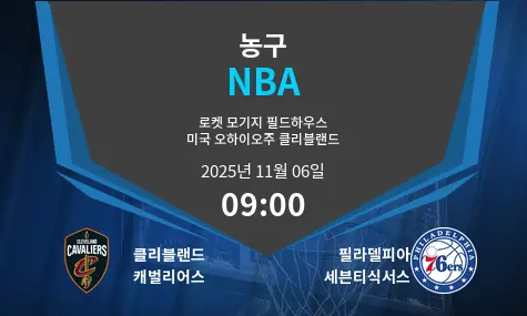 클리블랜드 캐벌리어스(4승 3패)가 로켓 모기지 필드하우스에서 필라델피아 세븐티식서스(5승 1패)를 맞이합니다. 캐벌리어스는 홈에서의 성적 개선을 노립니다. 세븐티식서스는 좋은 시즌 초반 기세를 이어가고자 합니다. 이 NBA 경기는 경쟁력 있는 두 동부 컨퍼런스 팀 간의 대결입니다. 양 팀 모두 최근 좋은 경기력을 보이고 있습니다.