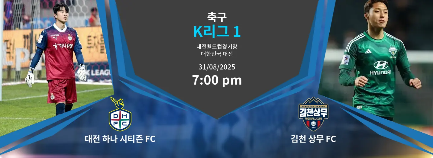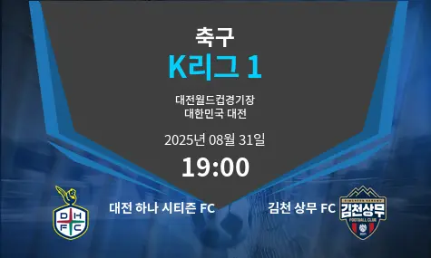 대전 하나 시티즌 FC와 김천 상무 FC의 K리그 1 경기는 2025년 08월 31일 19:00 KST, 대한민국 대전월드컵경기장에서 열린다. 대전은 홈 이점을 활용해 반전을 노리고 있으며, 김천은 최근 무패 행진과 안정적인 경기력으로 자신감을 안고 원정에 나선다.