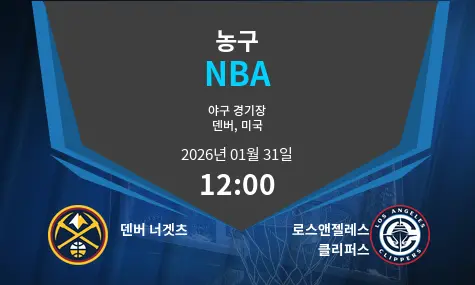 2026년 1월 31일 12:00, Ball Arena에서 덴버 너겟츠와 로스앤젤레스 클리퍼스 간의 경기가 열립니다. 이 두 팀은 이번 시즌에서도 강력한 경쟁 상대입니다. 덴버 너겟츠는 홈 구장의 이점을, 로스앤젤레스 클리퍼스는 그들의 강력한 로스터를 앞세워 치열한 경기를 펼칠 것입니다.