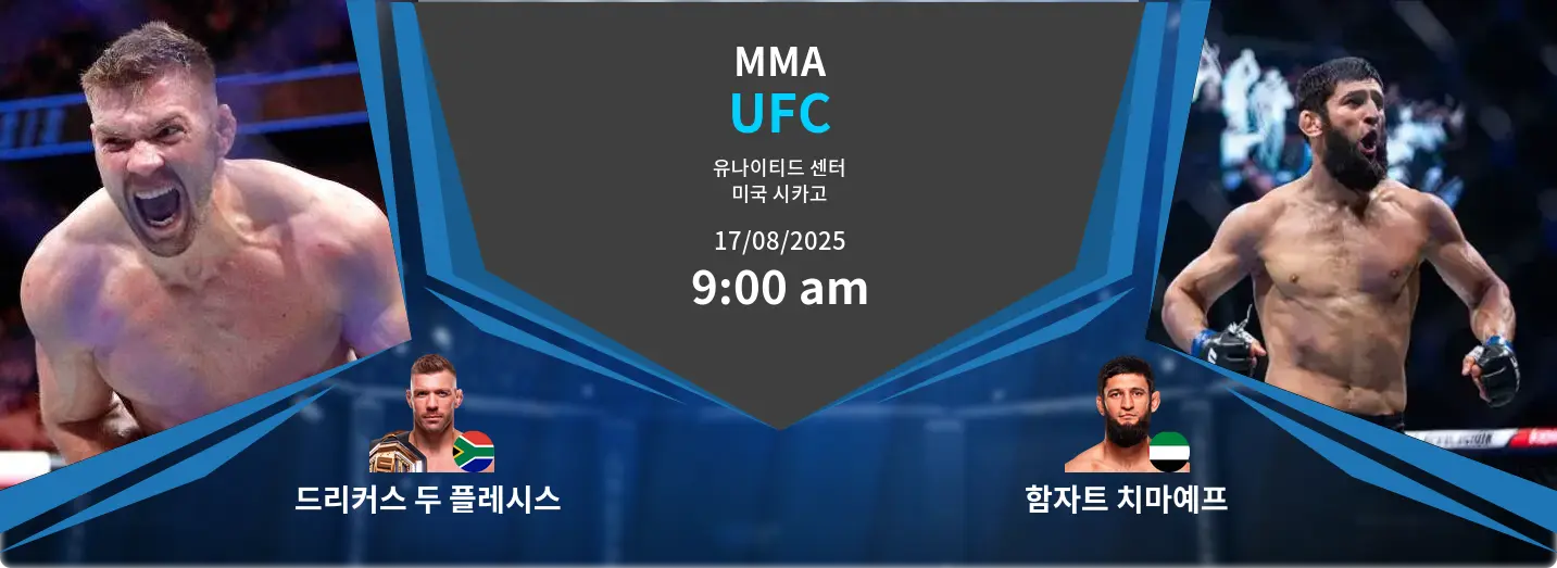 2025년 8월 17일 09:00 KST, 미국 시카고 유나이티드 센터에서 UFC 319가 열리며, 드리커스 두 플레시스와 함자트 치마예프가 미들급에서 맞붙습니다. 챔피언과 무패 도전자가 맞서는 이번 경기는 두 선수 모두 마무리 능력과 공격적인 스타일로 유명해, 매 순간이 결과를 바꿀 수 있는 치열한 대결이 될 것으로 보입니다.