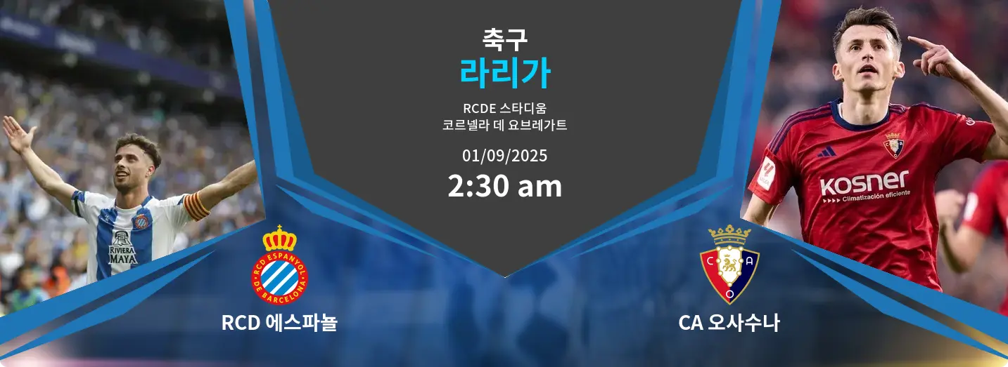 RCD 에스파뇰과 CA 오사수나는 9월 1일 오전 2시 30분(KST), 스페인 코르넬라 데 요브레가트에 위치한 RCDE 스타디움에서 라리가 맞대결을 펼칩니다. 시즌 초반, 양 팀 모두 승점을 확보하여 상위권 진입을 노리고 있으며, 에스파뇰은 최근 안정된 경기력을 바탕으로 상승세를 이어가고 있습니다. 반면, 오사수나는 핵심 선수들의 결장 속에서도 조직력을 되살리려는 모습입니다.