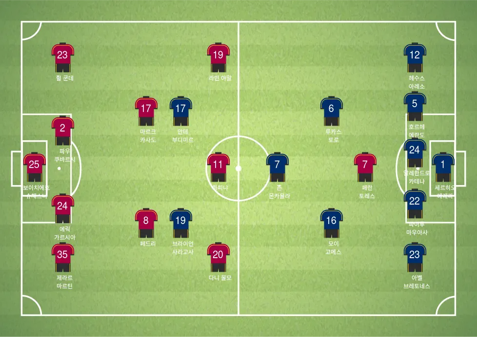 - 라미네 야말 (RW): 빠른 돌파와 드리블 능력으로 상대 수비를 흔드는 핵심 선수.