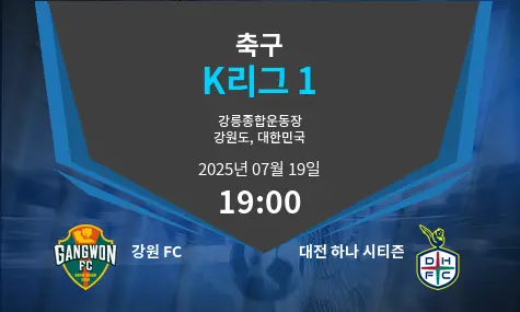 2025년 7월 19일 오후 7시, 강릉종합운동장에서 열리는 K리그1 경기에서 강원FC와 대전 하나 시티즌 FC가 맞붙습니다. 최근 흐름은 강원이 다소 우위이며, 대전은 무승부의 흐름을 끊고 승리를 노립니다.
