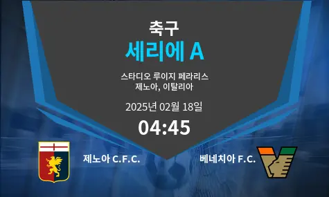 제노아와 베네치아는 2025년 2월 18일 KST 오전 4시 45분, 이탈리아 제노아의 스타디오 루이지 페라리스에서 열리는 세리에 A 경기에서 맞대결을 펼칩니다.