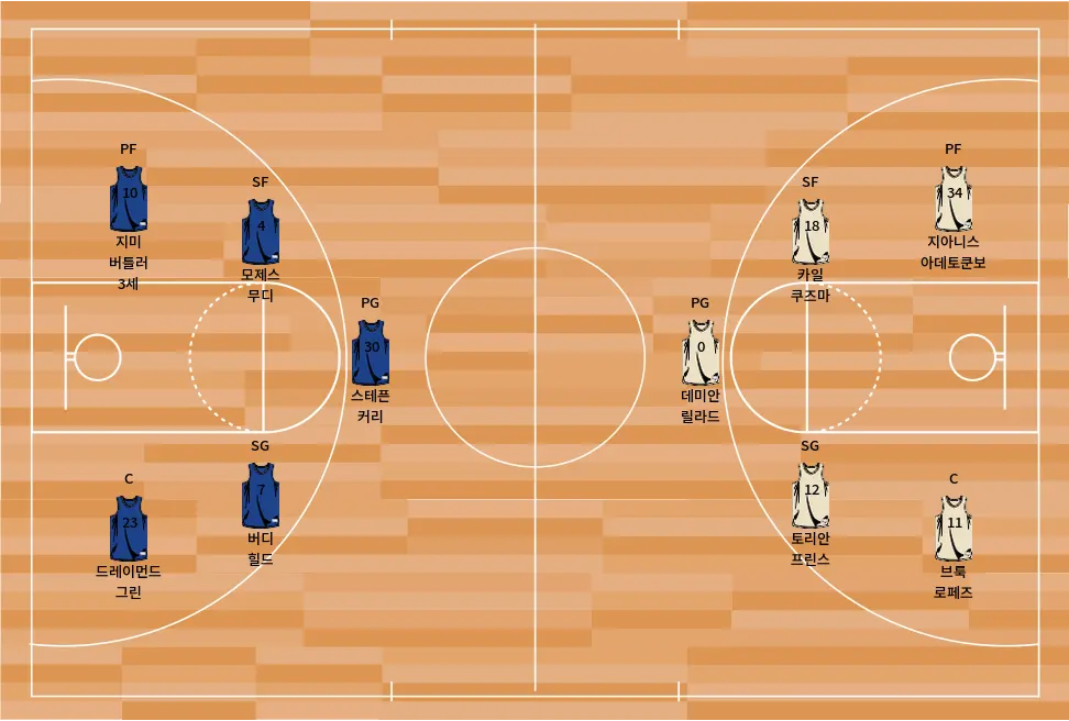 - 스테픈 커리 (PG, #30) – 워리어스의 공격을 이끄는 선수로, 뛰어난 3점 슈팅과 플레이메이킹 능력을 자랑한다.