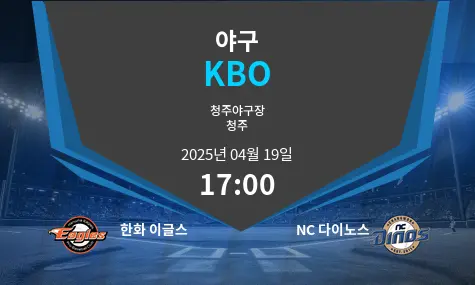 한화 이글스와 NC 다이노스의 맞대결은 **2025년 4월 19일 토요일 오후 5시(KST)**에 **청주야구장(청주, 대한민국)**에서 열립니다. 이번 KBO 주말 시리즈는 최근 상승세를 탄 한화와 흐름을 되찾으려는 NC의 흥미로운 대결입니다. 양 팀 모두 시리즈 초반부터 주도권을 잡기 위해 총력을 다할 것이며, 베테랑 선발 투수들이 마운드에 오를 예정입니다.
