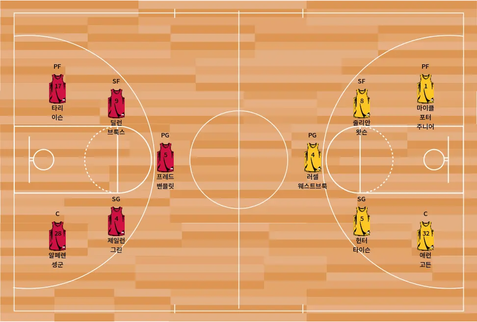 - 러셀 웨스트브룩 (PG) – 공격적인 드라이브, 플레이메이킹, 리바운딩으로 알려진 베테랑 포인트 가드입니다.