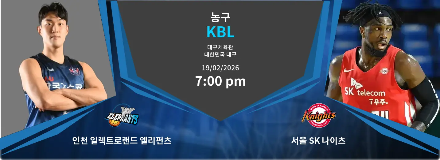 인천 일렉트로랜드 엘리펀츠와 서울 SK 나이츠의 경기는 대구체육선진화센터에서 2026년 2월 19일 오후 7시에 열립니다. 양 팀 모두 강력한 라인업을 자랑하며 치열한 경쟁을 예고하고 있습니다. 인천 일렉트로랜드 엘리펀츠는 빠른 공격 전개와 수비 안정성을 균형 있게 유지하고 있고, 서울 SK 나이츠는 공격적인 플레이와 강력한 수비로 경기를 주도하고자 합니다.