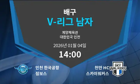2026년 1월 4일 14:00 인천 계양체육관에서 인천 한국공항 점보스와 천안 HC 스카이워커스의 경기가 예정되어 있습니다. 두 팀 모두 V-리그에서 중요한 위치를 차지하고 있으며, 이번 경기는 시즌 중반을 향해 달려가는 데에 중요한 전환점이 될 것입니다.