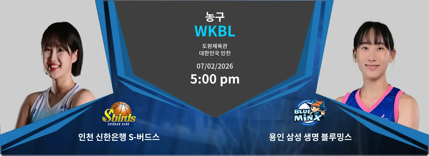 인천 신한은행 S-버드스 VS 용인 삼성 생명 블루밍스 경기가 2026년 2월 7일 17:00에 도원체육관에서 열립니다. 두 팀은 현재 리그에서 높은 경쟁력을 보이고 있으며, 이 경기는 시즌 후반부 판도를 결정짓는 중요한 만남이 될 것입니다.