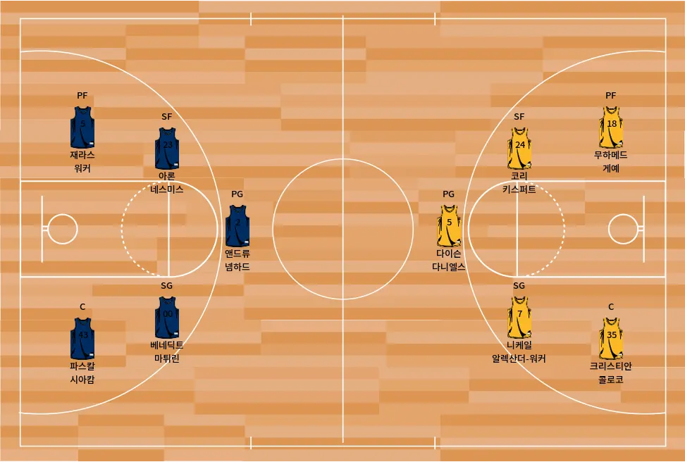 - 케일럽 존스: 수비에서 강력한 존재감을 발휘하며 페이서스의 중심축 역할을 합니다.