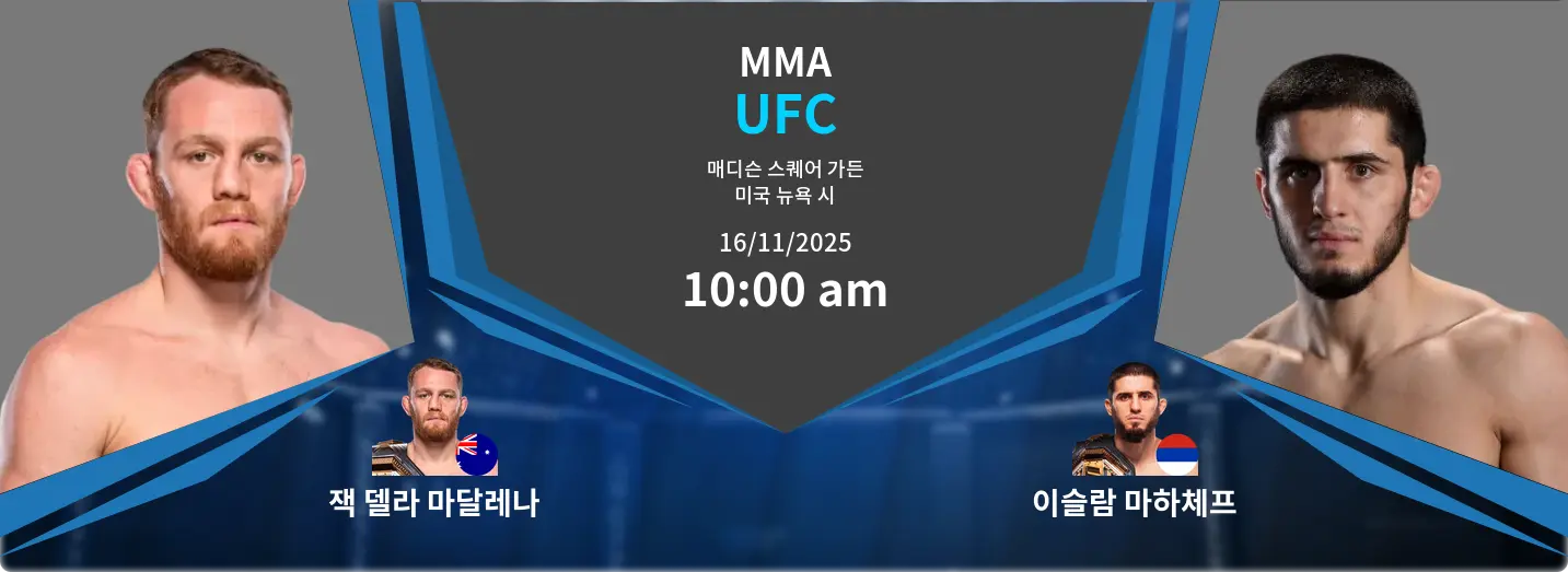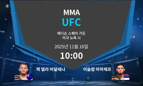 이번 메인 이벤트는 2025년 11월 16일 미국 뉴욕 시의 매디슨 스퀘어 가든에서 열리는 UFC 322의 웰터급 타이틀전입니다. 이 경기는 다이내믹한 타격가인 챔피언 잭 델라 마달레나와 웰터급 타이틀에 도전하는 압도적인 그래플러 이슬람 마카체프가 맞붙는 경기입니다. 경기는 고전적인 타격가 대 그래플러의 대결 구도를 띨 것입니다. 마달레나는 리치 우위와 높은 KO율을 자랑합니다. 마카체프는 뛰어난 레슬링과 서브미션 기술로 맞설 것입니다.