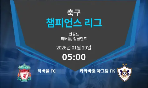 리버풀 FC와 카라바흐 아그담 FK의 매치가 2026년 1월 29일 영국의 안필드 경기장에서 오전 05:00에 열린다. 이 경기에서는 양 팀이 각자의 강점을 발휘하여 치열한 격전을 벌일 것으로 기대된다.