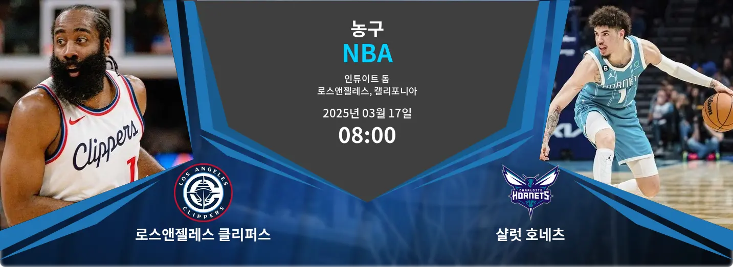 로스앤젤레스 클리퍼스는 2025년 3월 17일 08:00 KST, **인튜이트 돔(Intuit Dome)**에서 샬럿 호네츠를 상대한다. 클리퍼스는 36승 30패로 서부 컨퍼런스에서 경쟁력을 유지하고 있으며, 호네츠는 16승 49패로 동부 컨퍼런스 하위권에 머물러 있다.