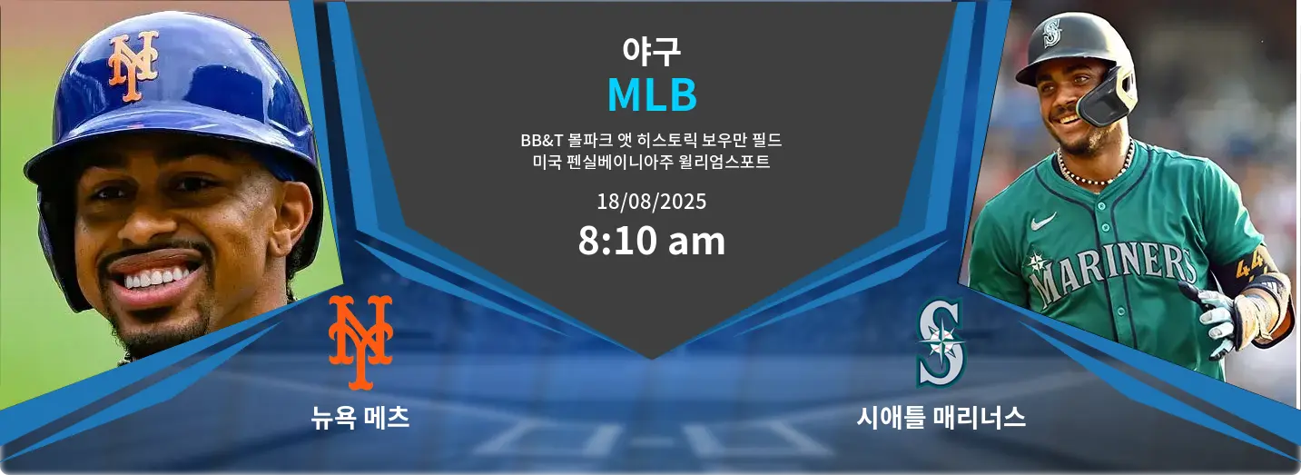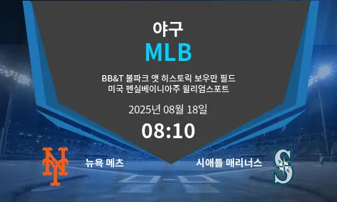 뉴욕 메츠와 시애틀 매리너스는 2025년 8월 18일, 펜실베이니아주 윌리엄스포트의 BB&T 볼파크 앳 히스토릭 보우만 필드에서 맞붙습니다. 매리너스는 최근 경기 기록과 투·타 효율 면에서 우세를 보이고 있습니다. 반면, 메츠는 강력한 홈런 타자들의 장점을 살려 점수 차를 줄이려 할 것입니다. 양 팀 모두 부상자가 있어, 선수층과 불펜 운영이 경기 결과에 중요한 변수가 될 전망입니다.