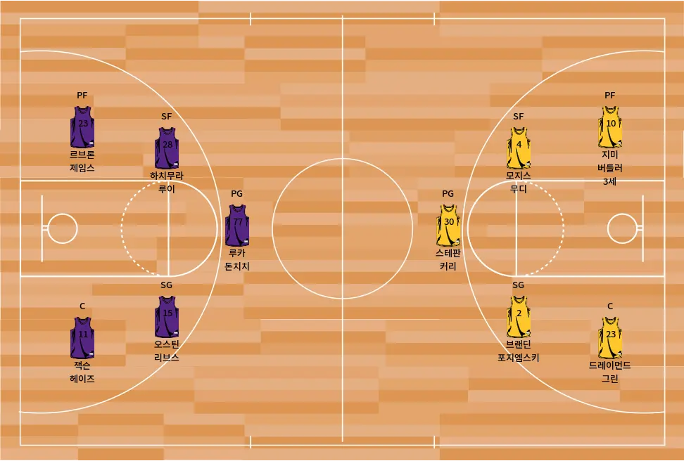 레이커스는 루카 돈치치와 르브론 제임스가 중심입니다. 돈치치는 뛰어난 득점력과 플레이메이킹으로 팀의 공격을 이끌고 있으며, 르브론은 여전히 전천후 활약으로 팀에 큰 기여를 하고 있습니다. 하치무라 루이 역시 공격과 수비 모두에서 안정적인 모습을 보여주고 있습니다.
