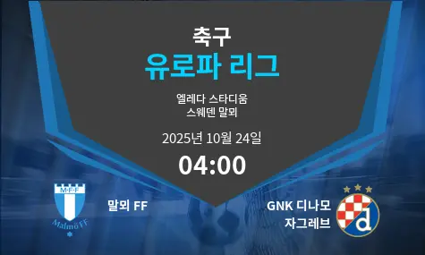 UEFA 유로파리그에서 말뫼 FF와 디나모 자그레브가 2025년 10월 24일 스웨덴 말뫼의 엘레다 스타디움에서 맞붙습니다. 말뫼는 최근 부진과 부상 악재로 어려움을 겪고 있으며, 유로파리그 두 경기 모두 패배했습니다. 반면 디나모 자그레브는 연승을 기록하며 조 1위를 달리고 있습니다.