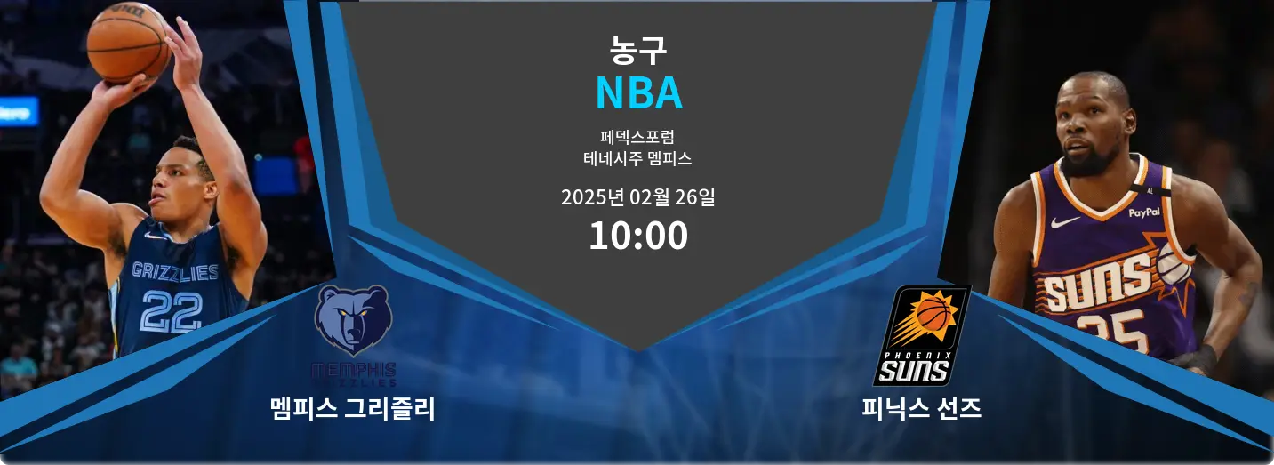 멤피스 그리즐리스와 피닉스 선즈가 2025년 2월 26일 오전 10시(KST), 미국 테네시주 멤피스의 페덱스포럼에서 중요한 맞대결을 펼칩니다. 양 팀 모두 플레이오프 순위를 위해 필수적인 승리를 노리고 있어 시즌 후반부의 중요한 경기입니다. 멤피스는 홈 경기장의 이점을 살리려 하고 있으며, 피닉스는 주요 선수들의 부상을 극복하고 강력한 공격력을 유지하려 합니다. 이번 경기는 멤피스의 빠른 템포와 높은 에너지를 활용한 경기 방식과 피닉스의 효율적이고 스타 중심적인 공격 시스템 간의 대결이 될 것입니다.