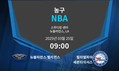 뉴올리언스 펠리컨스는 2025년 3월 25일, 루이지애나주 뉴올리언스의 스무디 킹 센터에서 필라델피아 76ers와 맞붙습니다. 경기 시작은 한국 시간으로 오전 9시입니다. 이 경기는 펠리컨스가 홈코트 이점을 활용하려는 반면, 76ers는 부상 문제에도 불구하고 경쟁력을 유지하려는 흥미로운 대결이 될 것입니다. 양 팀 모두 강력한 공격력을 갖추고 있지만 주요 선수들의 부상으로 고전하고 있어, 이 경기는 높은 득점과 빠른 템포가 예상됩니다.