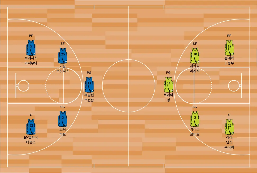 - 제일런 브런슨 (PG, #11): 닉스의 주 득점원이며, 경기 흐름을 조절하는 플레이메이커.