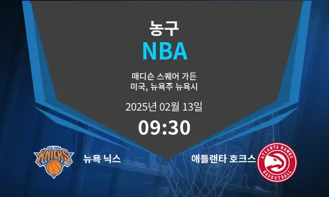 뉴욕 닉스가 뉴욕 매디슨 스퀘어 가든에서 애틀랜타 호크스를 맞이한다. 닉스는 리그 최고 수준의 수비와 느린 경기 템포를 활용하여 경기를 장악하려 할 것이다.