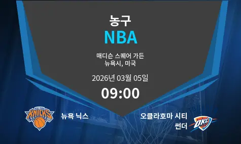 뉴욕 닉스와 오클라호마 시티 썬더의 경기는 2026년 3월 5일 마디슨 스퀘어 가든에서 오전 9시에 치러질 예정입니다. 이번 매치는 두 팀의 중요한 시즌 기대치를 가늠할 수 있는 기회가 될 것입니다. 뉴욕 닉스는 홈 코트의 이점을 살리기 위해 준비 중이며, 오클라호마 시티 썬더는 공격적인 플레이로 인상적인 경기력을 보여줄 계획입니다. 두 팀 모두 시즌 후반부의 중요한 승리를 쟁취하기 위해 최고 수준의 경기를 펼칠 것으로 예상됩니다.
