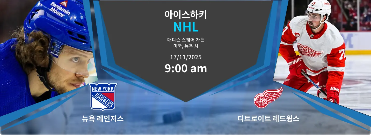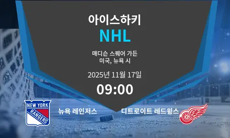 이 NHL 경기는 2025년 11월 17일에 뉴욕 레인저스가 매디슨 스퀘어 가든에서 디트로이트 레드윙스를 맞이합니다. 두 팀 모두 시즌 초반에 경쟁력을 보이고 있으며, 승점 20점으로 순위에서 동률을 이루고 있습니다. 레인저스는 강력한 골텐딩과 수비에 의존합니다. 레드윙스는 폭발적인 공격력과 강력한 파워 플레이 유닛으로 맞섭니다. 이 경기는 속도감 있는 플레이와 조직력의 대결이 될 것으로 예상됩니다.
