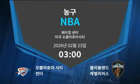 2026년 2월 23일에 Paycom Center에서 열리는 오클라호마 시티 썬더와 클리블랜드 캐벌리어스의 경기 시간이 03:00에 예정되어 있습니다. 이 두 팀은 치열한 경기를 펼칠 것으로 예상됩니다.