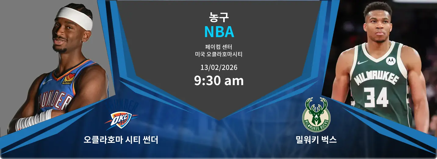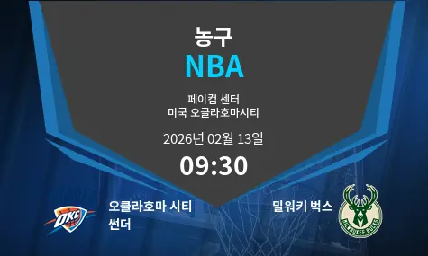 2026년 2월 13일 오전 9시 30분에 오클라호마 시티 썬더와 밀워키 벅스가 Paycom Center에서 맞붙습니다. 양 팀 모두 뛰어난 성적을 자랑하며 팬들에게 흥미진진한 경기를 선사할 것으로 기대됩니다.