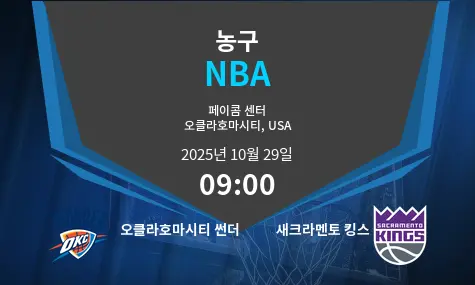 오클라호마시티 썬더는 2025년 10월 29일 오전 1시(미국 동부시간) 오클라호마시티 페이컴 센터에서 새크라멘토 킹스와 맞붙습니다. 두 팀 모두 젊은 핵심 선수들과 베테랑 리더십을 바탕으로 시즌 초반 강세를 보일 것으로 예상됩니다. 썬더는 젊은 핵심 선수들의 역동적인 수비와 역동적인 득점력에 의존하는 반면, 킹스는 외곽 슈팅과 골밑에서의 강점을 활용하는 다재다능한 공격력을 자랑합니다.