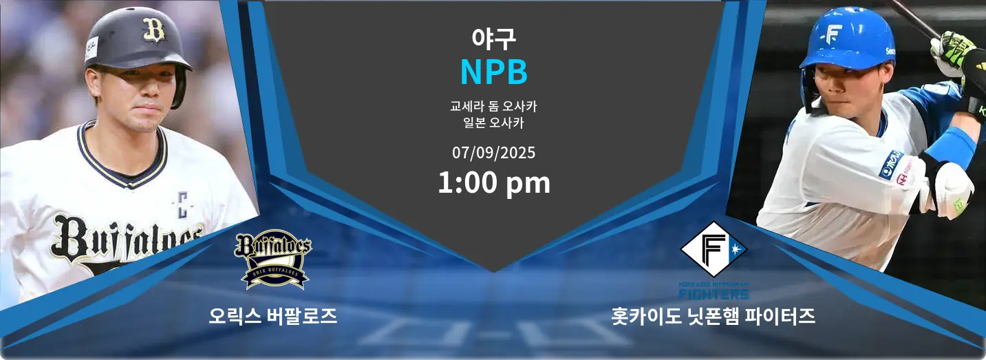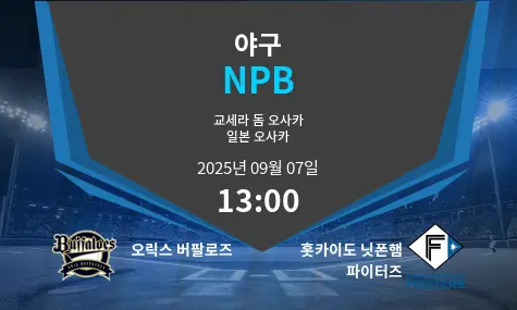 2025년 9월 7일 오후 1시(KST), 일본 오사카에 위치한 교세라 돔 오사카에서 오릭스 버팔로즈가 홋카이도 닛폰햄 파이터즈를 홈으로 맞이합니다. 정규 시즌 후반으로 접어든 시점에서, 이번 경기는 오릭스에게는 플레이오프 진출을 굳히기 위한 중요한 경기이며, 닛폰햄은 상위권 팀을 상대로 경쟁력을 유지하려는 의지가 엿보입니다.