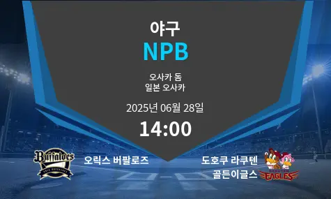 2025년 6월 28일 오사카 돔에서 오릭스 버팔로스가 도호쿠 라쿠텐 골든이글스를 상대합니다. 오릭스는 시즌 성적과 투수력 면에서 우위를 보이며, 라쿠텐은 최근 공격력을 바탕으로 반전을 노립니다.