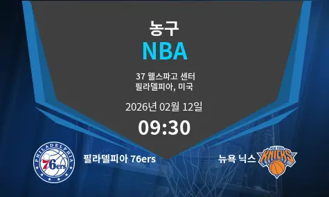 필라델피아 76ers와 뉴욕 닉스의 경기 분석입니다. 이 경기는 2026년 2월 12일 09:30에 Xfinity Mobile Arena에서 열립니다. 두 팀은 시즌 중 중요한 경기에서 맞붙게 되며, 경기의 결과는 순위에 큰 영향을 미칠 수 있습니다.
