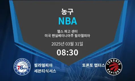 2025년 3월 31일 오전 08시 30분(KST), 필라델피아의 웰스 파고 센터에서 필라델피아 76ers와 토론토 랩터스의 경기가 열립니다. 두 팀 모두 이번 시즌 부진한 성적을 보이고 있으며, 40% 이하의 승률을 기록 중입니다. 필라델피아는 조엘 엠비드와 타이리스 맥시의 부상으로 전력이 약화되었고, 토론토 역시 그래디 딕과 야콥 퍼틀의 부재로 어려움을 겪고 있습니다. 양 팀 모두 수비 불안과 빠른 공격 전개로 인해 높은 득점 경기가 예상됩니다.