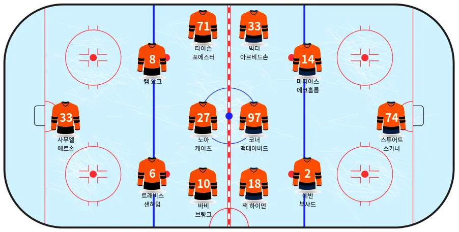- 사무엘 에르손 (G, #33) – 필라델피아의 주전 골리로 .898 세이브율을 기록 중이며, 오일러스의 강한 슈팅을 막아야 합니다.