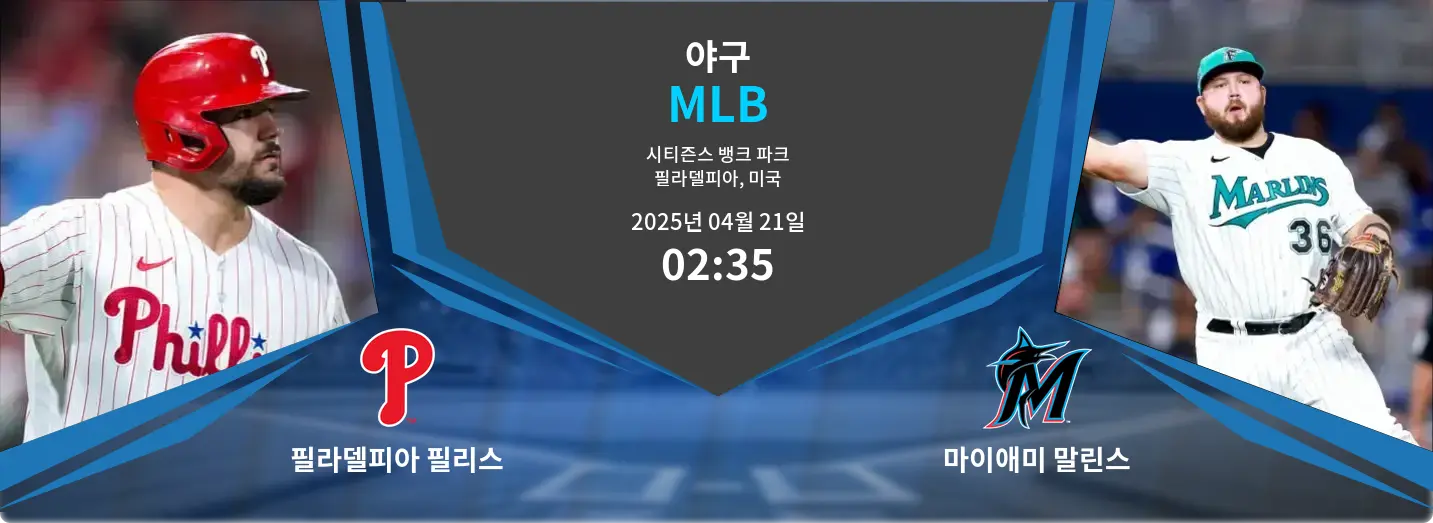 미국 필라델피아의 시티즌스 뱅크 파크에서 **4월 21일 오전 2시 35분 (KST)**에 필라델피아 필리스가 마이애미 말린스를 홈으로 맞이합니다. 내셔널리그 동부지구의 이 맞대결은 최근 부진을 만회하려는 필리스와 상승세를 타고 있는 말린스의 대결입니다. 양 팀 모두 주요 선수들의 부상으로 전력 누수가 있어 벤치 깊이가 중요한 요소가 될 예정이며, 특히 타자에게 유리한 구장이 경기에 큰 영향을 줄 수 있습니다.