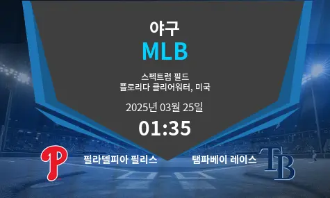 필라델피아 필리스는 2025년 3월 25일 오전 1시 35분 KST에 **스펙트럼 필드(플로리다, 클리어워터)**에서 탬파베이 레이스를 상대한다. 이번 경기는 시즌 성적에서 차이를 보이는 두 팀의 대결이다. 필리스는 95승 67패의 성적으로 강력한 경쟁력을 보이고 있으며, 레이스는 80승 82패로 다소 고전했다. 필리스가 공격과 투수진에서 더 우위를 점하고 있어 유리한 상황이다.